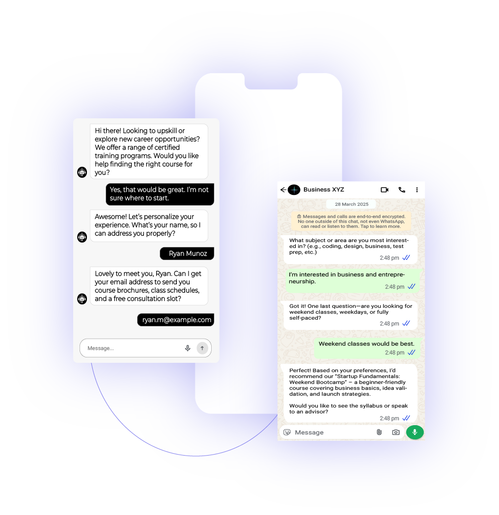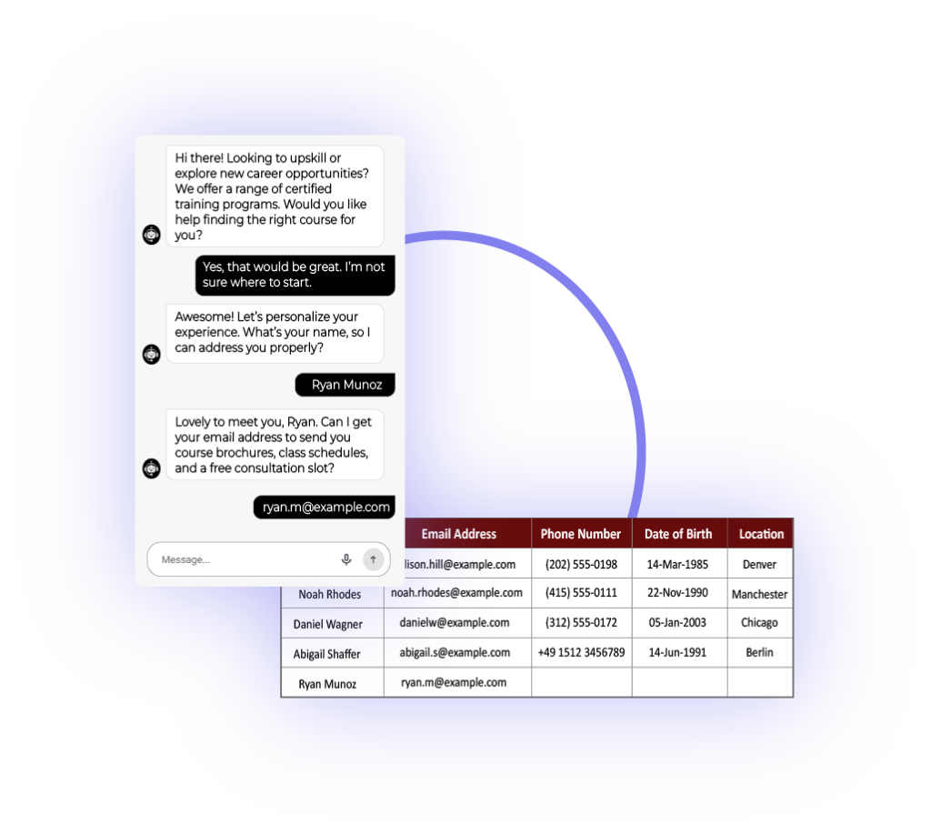 With our AI agents, you don’t have to worry about missing out on leads. Our agents instantly interact with every lead and collect all of their relevant data and store in your data-base.