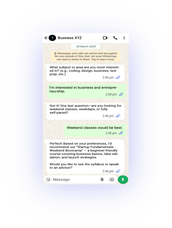 With the help of AI Agents, you can automate appointment scheduling for demo sessions, consultations, or class enrollments via WhatsApp, your website, Facebook, Instagram, and more.