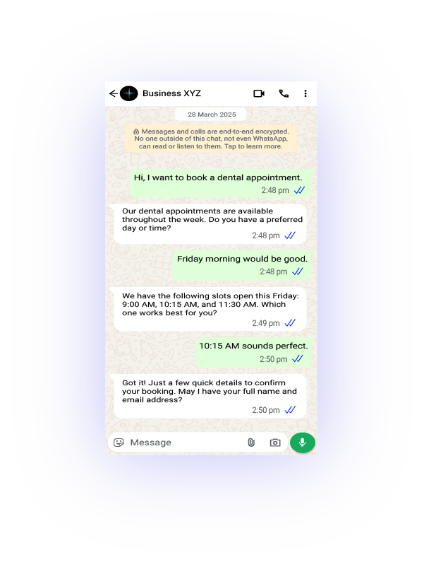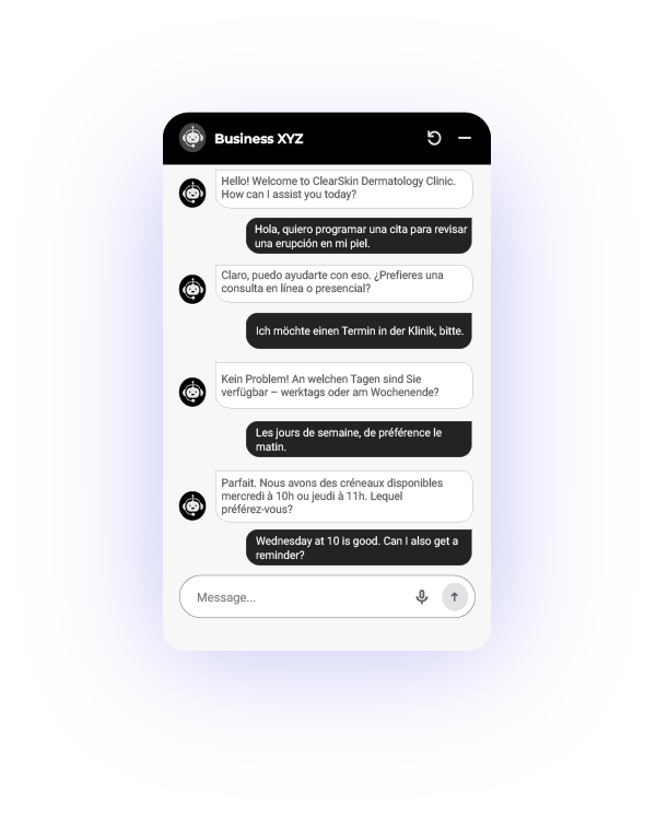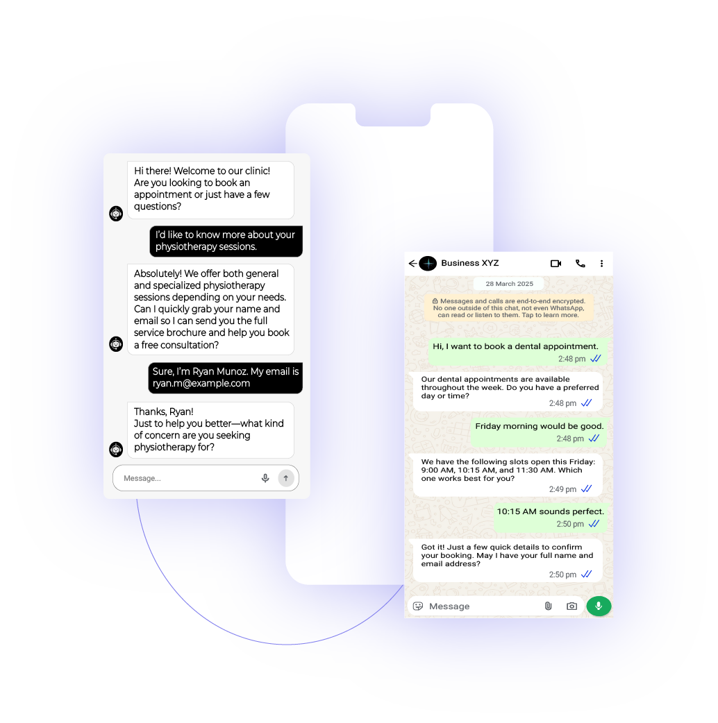 With AI Agents, instantly respond to patient queries about treatments, appointment availability, insurance, and clinic hours, on your website, WhatsApp, Instagram, or Facebook—24/7.