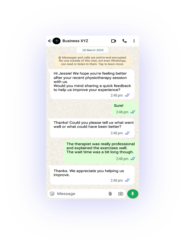 With the help of AI Agents, you can automate feedback collection after each appointment, consultation, or treatment—on WhatsApp, your website, Facebook, Instagram, and more.