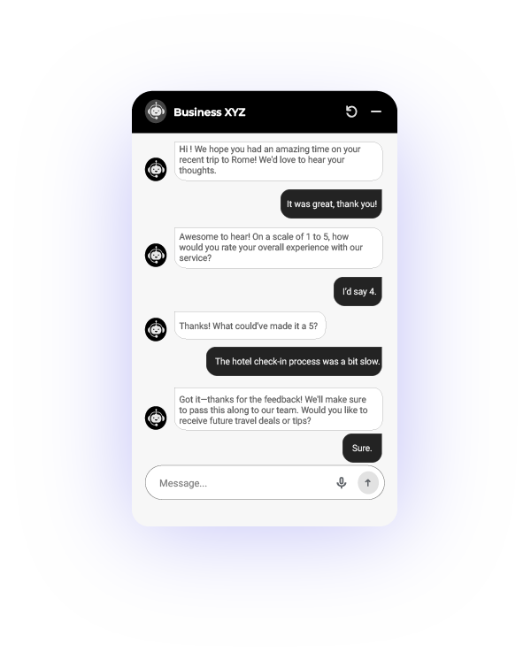 Gather real-time insights into customer satisfaction, destination experience, and service quality. Identify areas for improvement and continuously enhance the travel journey, without adding extra tasks to your support team.